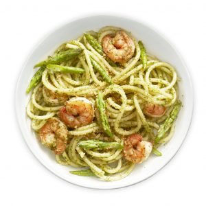 جمبري، فلفل أحمر، فلفل أخضر، بصل، رقائق الفلفل الحار، فلفل الليمون، موزاريلا، مع صلصة الأيولي